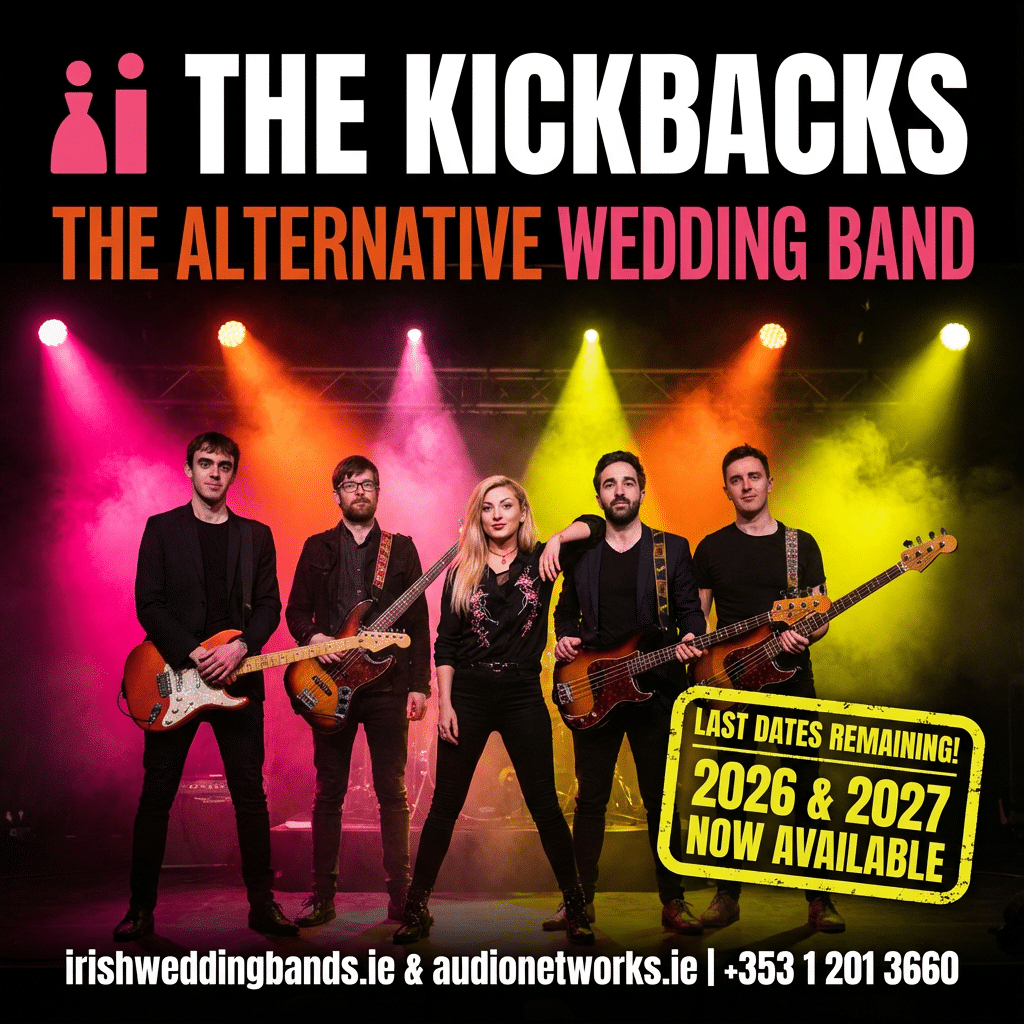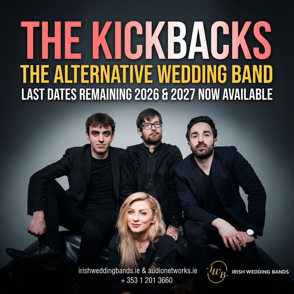 Get ready to lose it, … The KickBacks are the electrifying 4-piece cover band every cool couple is fighting to book – a total powerhouse packed with Ireland’s most in-demand session legends straight out of Dublin. Dates are disappearing FAST – don’t sleep on the band everyone’s obsessing over!
